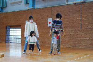 フープで遊んだり、リングを飛び越えたり運んだりしながら