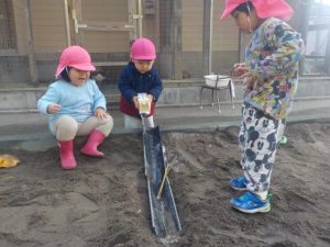 ”そうめん流し”が始まっているようです👏スコップを持っていたお友だちも,「もっと掘ってみよう」「どうしたら水が流れるかな?」といろんな方法を試してみて,上手く水が流れた時の笑顔はキラキラしていました😄