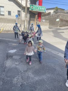お友だちに「手を繋ごう♡」と誘い、しっかり手を繋いで歩くことができました。