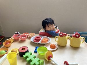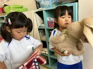 年少組さんは、ソフトブロックを使ってベッドを作り、おままごと遊びをしていました。