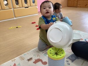 ボールプールの中にボールを少しずつ入れると、上からボールが落ちてくることと、ボールが増えていくことが楽しかったらしく喜ぶ姿がありました😆