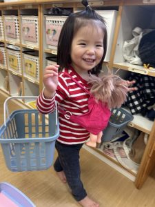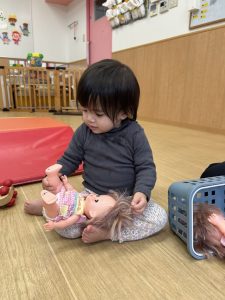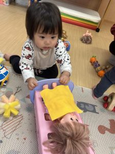 お人形をトントンしながら優しく寝かせてあげたり抱っこしてあげたりしほほえましい場面がたくさんです🧸