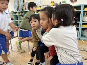 そして室内では「伝言ゲーム」をしました。言葉を伝える,聞くという大切さを伝え,始めました👂