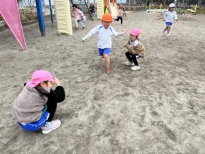 園庭では「節分鬼ごっこ」。タッチされたら豆に変身✨仲間がタッチしたら戻れます。チームの友だちとたくさん助けることを目標にゲームを始めました🎵