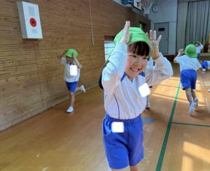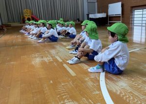 笛の合図に合わせて起立や着席したり、「で~きたできた」「な~にができた」の掛け声に合わせて、ネコやペンギン、鳥など様々な動物に変身したりと、楽しみながら活動に参加していましたよ😊
