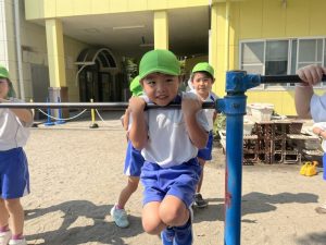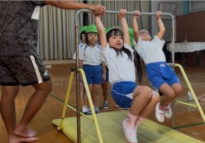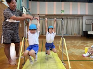 上手に鉄棒に乗ることが難しく、苦戦する様子もありましたが、