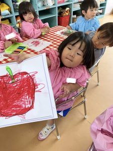 リンゴ、キャンディ、車、象、イチゴなどから好きな題材を選び、クレヨンで思い思いに描くことを楽しみました💖
