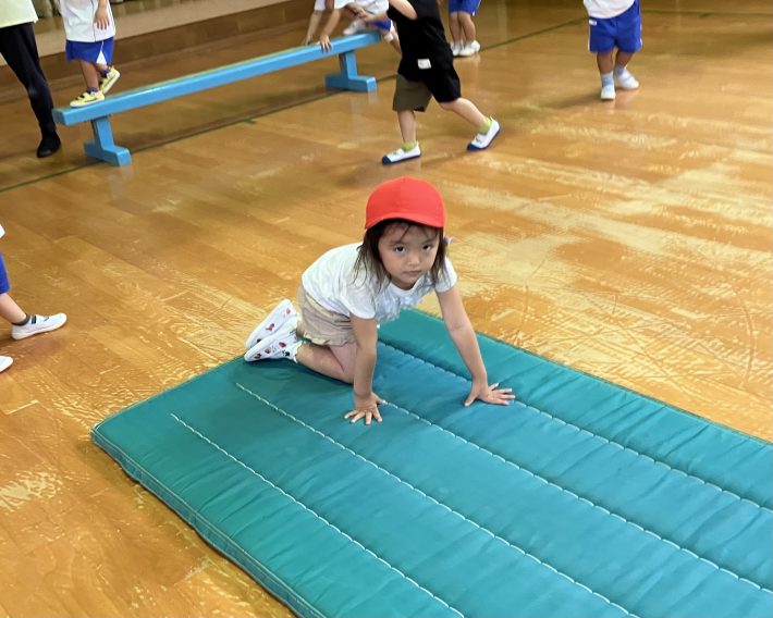 体育館へ行く前からとてもわくわくしている様子で体育館に並べられた遊具を見て大興奮!先生から遊び方のお話を聞いた後ほし組さんから順番にチャレンジしていきました😊
