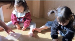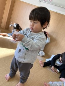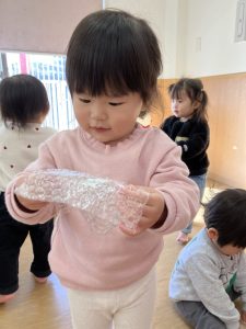 はじめのうちはプチプチすることが難しかったお友だちも先生と一緒にしたりすることで上手になったり、床に置いてプチプチしたりと、段々とコツをつかんでいっていました✨