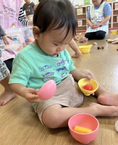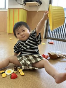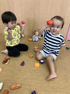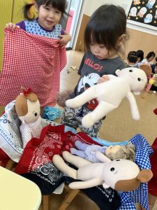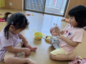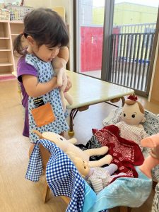 ままごと遊びの玩具や赤ちゃんのお人形を準備すると…