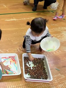 どれがいいかな??とどんぐりや葉っぱ、ストローなどを自分で選ぶ子どもたち🍁