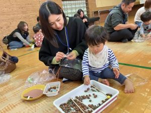 シールを貼ったり、入れ物にどんぐりなどの材料を出し入れを楽しみながら太鼓の完成です!!