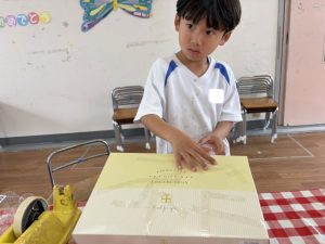 朝は雨で遊具が濡れていたので、お部屋で塗り絵をしたり、廃材を使って犬やロボットを作ったり、、