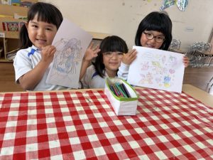 朝は雨で遊具が濡れていたので、お部屋で塗り絵をしたり、廃材を使って犬やロボットを作ったり、、