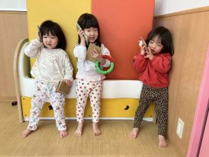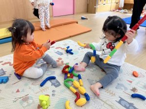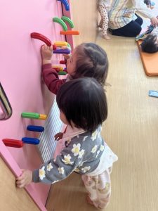 ゆき組のお部屋で磁石ブロック、カラーブロック、赤ちゃんのお人形、携帯電話などでそれぞれ好きな遊びを見つけて楽しみました😊