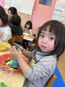 カラフルな小麦粉粘土が登場すると、子どもたちはとっても嬉しそうに手を伸ばして触ってみることができましたよ🤗