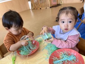 たくさん触って遊んだ後は、透明カップやフォークも使って春雨遊びを楽しみました😆