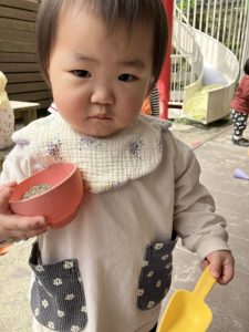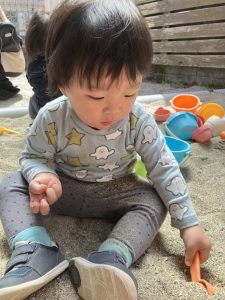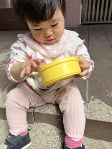 スコップやミニカップなど好きな砂場道具を見つけて、砂の出し入れを楽しみました♡