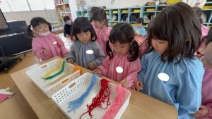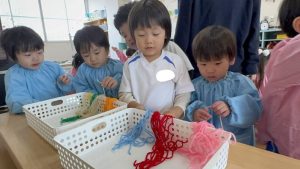 好きな色の材料を選んだあとはいよいよ自分たちで毛糸を通します!初めは少し難しい様子だった子どもたちも繰り返していくうちにどんどん早く毛糸を通すことができるようになっていき、最終的にはもっとやりたい!と色鮮やかな毛糸帽子が完成していました🧶