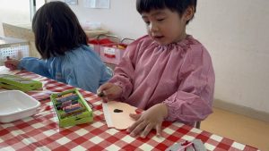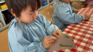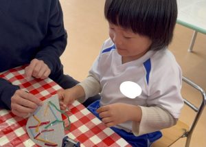今日は毛糸を使って帽子作りをしました🧶毛糸を使った製作活動は2回目でしたが、毛糸を穴に通して製作する活動は初めてだったので、子どもたちもどんな帽子ができるんだろう?とわくわくしている様子でした😄