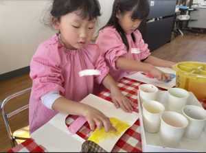 指絵の具を使って、好きな色でお面の土台を作りましたよ♪