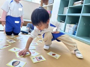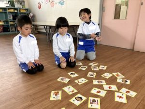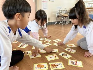 「これ、さっき言ってたね!」と英語の先生が言う英単語に耳を澄ませ、一生懸命にカードを探す子どもたち😆