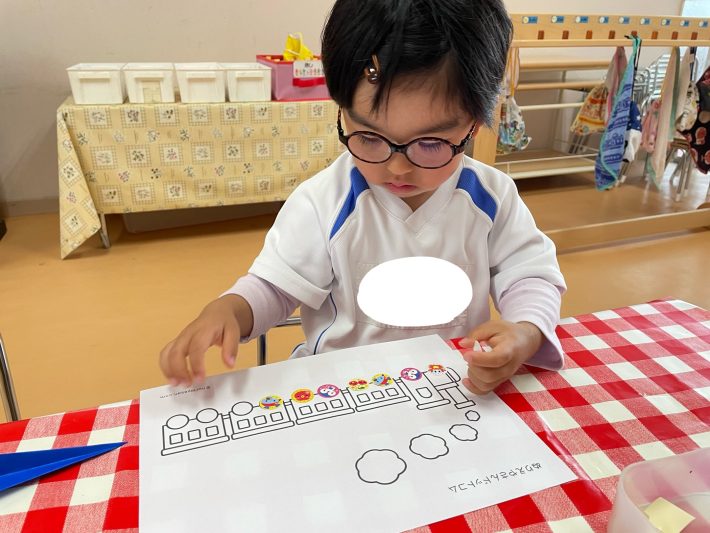 新しいクラスで少し緊張気味だったお友だちも少しずつ緊張が解け、お友だちと一緒にお部屋で塗り絵をしたり、シールを貼って絵を完成させたりなど楽しく過ごしていました。