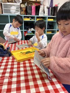 さっきまで賑やかだった年少組さんも、糸通しをするときにはとても真剣な表情でした。