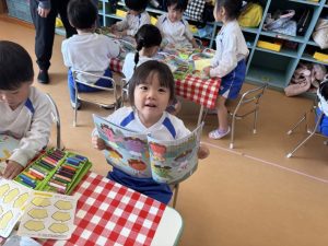 その後は豆まきカードを使って豆まきをしました。物語を巡りながら、「おにはそとー!」と言いながらカードを当てて楽しく遊びました💖