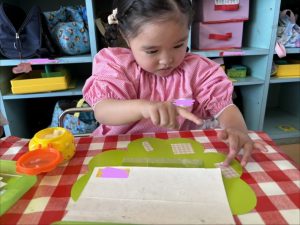 写真立て作りでは、前回の活動の様子を振り返り、自分たちで切った折り紙をのりで貼って写真立てを完成させることができました🍀