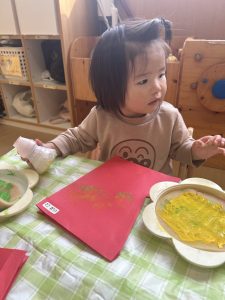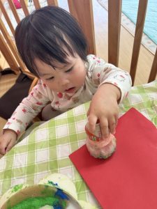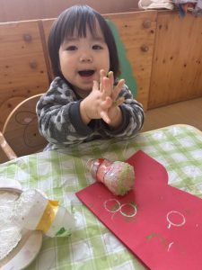 手やお顔に絵の具をつけながら、上手にできました🎄