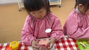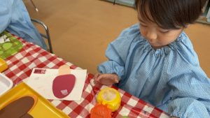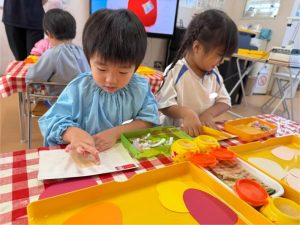 指先を使って集中してちぎっていると、色々な形のちぎり紙ができたことに気づいたお友だちもいました♩